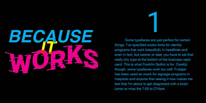 According to Michael Bierut, there are 13 reasons to pick a typeface. This book has all 13 reasons with a font to match the explanation. Bierut goes into extensive detail about each reason. The colors are true CMYK to mimic an overprint design.